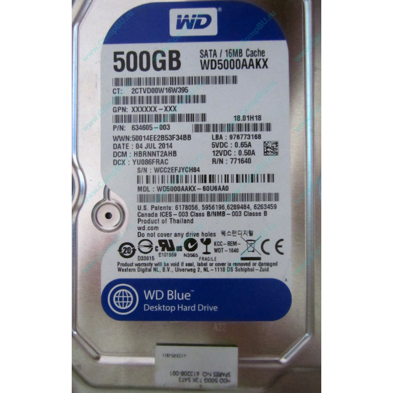 Жёсткий диск для серверов и рабочих станций HP 3.5" 500Gb 7.2k (500 гигабайт, 7200 rpm) WD WD5000AAKX SATA (HP pn 634605-003, spare pn 613208-001). Можно устанавливать не только в компьютеры Hewlett Packard.